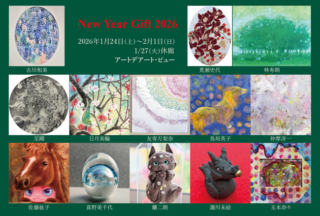 New Year Gift 2026 荒瀬史代 佐藤紘子 至剛 瀧川未絵 玉本奈々 友寄万梨奈 鳥垣英子 仲摩洋一 林寿朗 日月美輪 古川和美 真野美千代 蘭二朗 2026年1月24日(土) ~ 2月1日(日) 12:00~18:00 <最終日は17:00迄・1/27(火)休廊> 恒例の作家別*福袋*あり! ガチャガチャもお楽しみに!